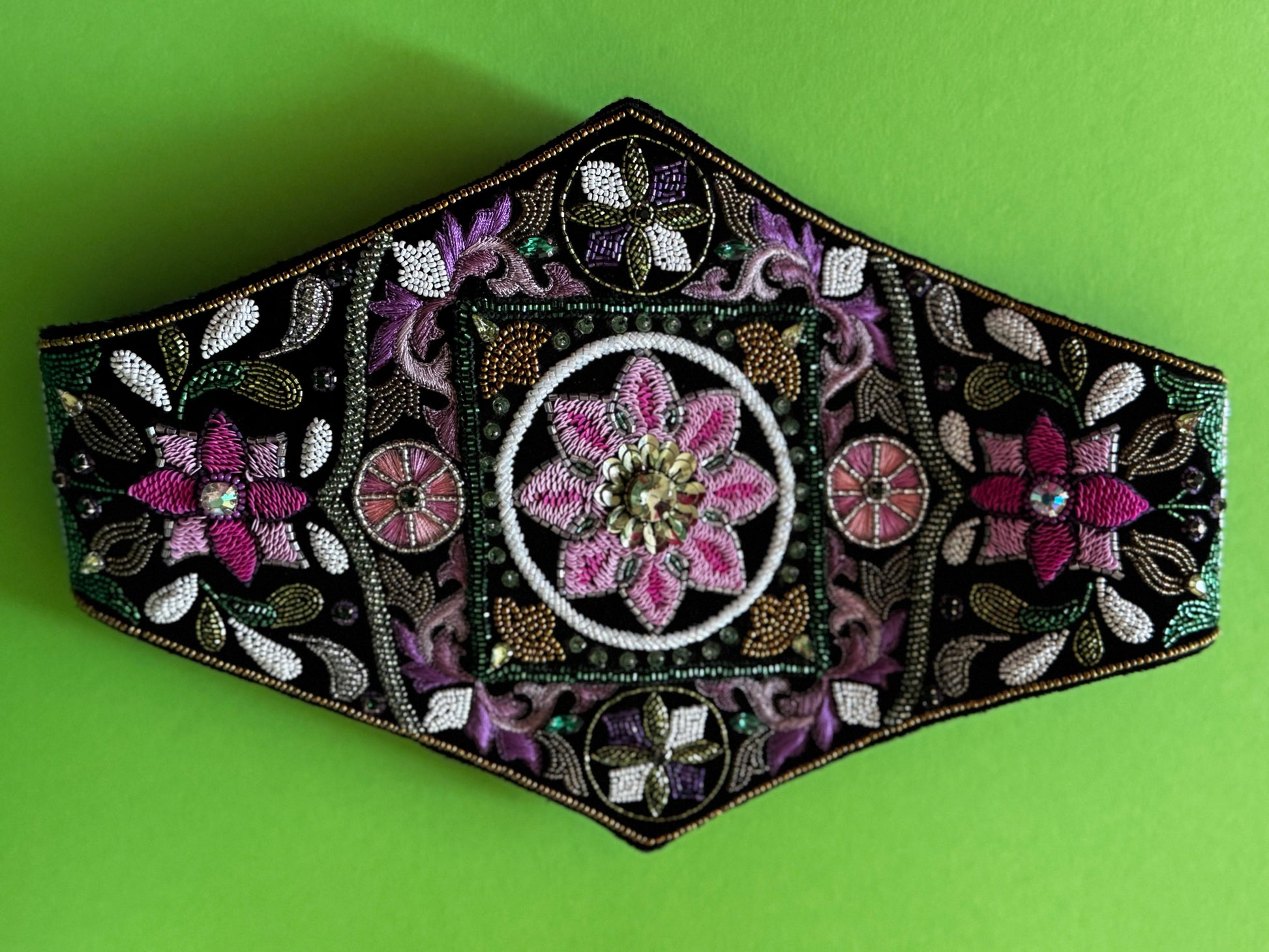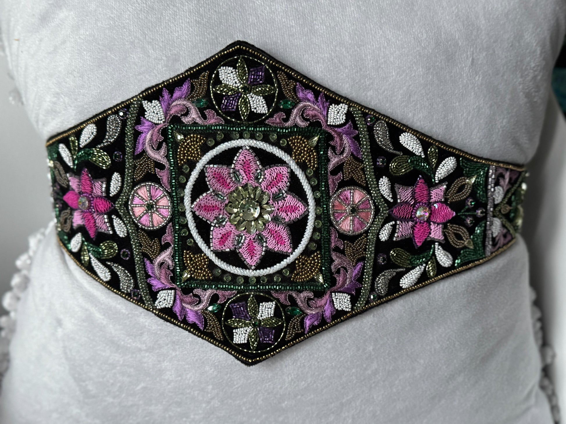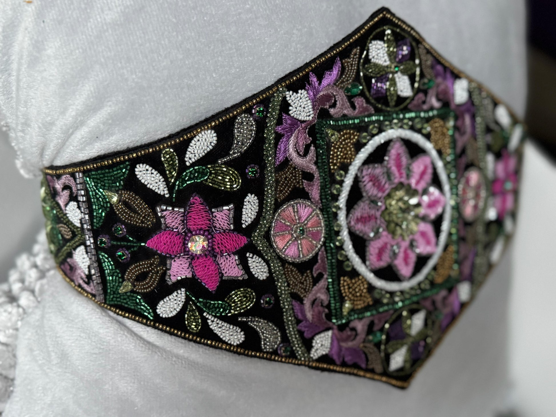 Keep the belt away from moisture, fragrance, and rough surfaces that may snag the embroidery. Do not machine wash, steam, or iron directly on the velvet or beadwork. For cleaning, consult a professional dry cleaner experienced in delicate embellished textiles. Store flat or in box to protect the embroidery and velvet texture.