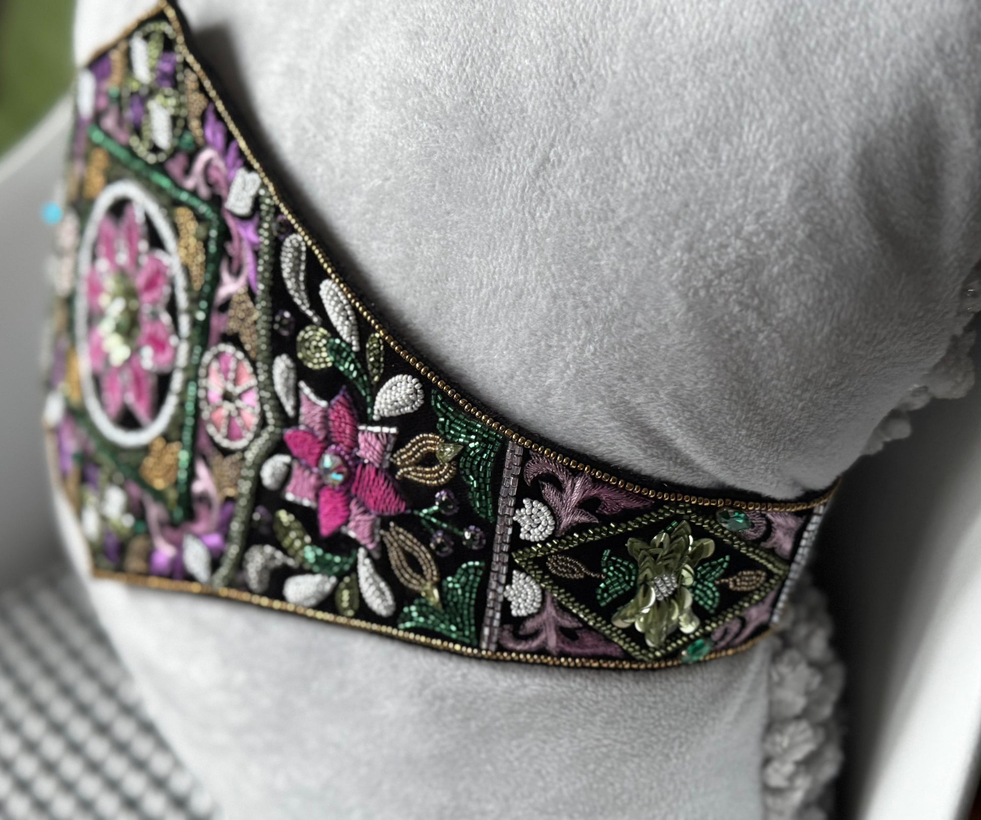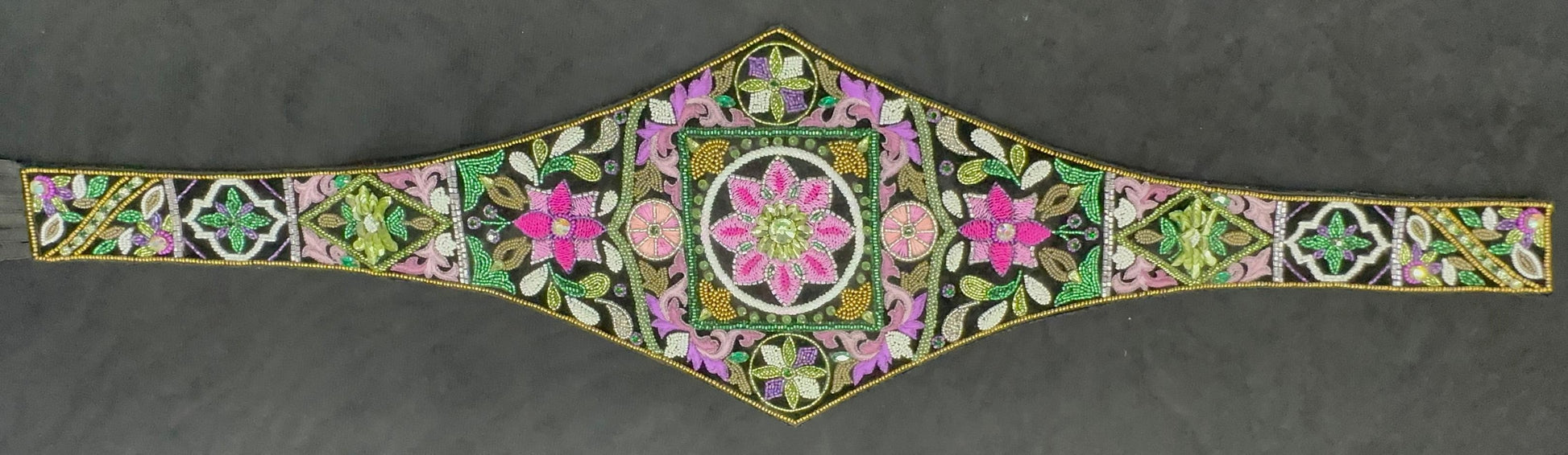 This belt showcases authentic Aari embroidery on velvet, combined with hand-placed beads in shades of violet, pink, and gold. Its garden-inspired design features miniature floral motifs crafted with precision, making each belt a one-of-a-kind wearable artwork rather than a mass-produced accessory.